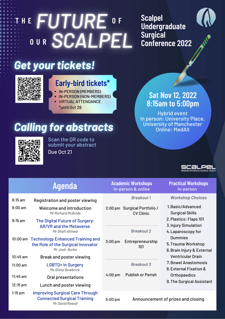 Surgery has developed and grown extensively throughout history and continues to evolve to solve ever-changing medical challenges. In the future, surgery will be a synergic collaboration between surgeons, digital technology, machines and robots. This conference will aim to explore the possibilities of ‘The Future of Our Scalpel’ and inspire medical students to engage in surgical innovation.